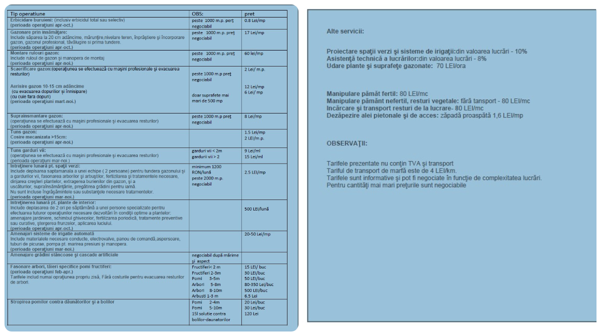 Tarife amenajari/intretinere spatii verzi 2024